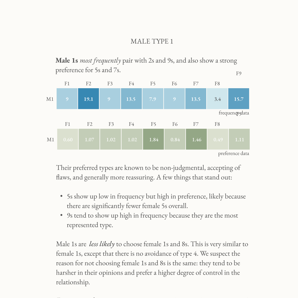 Blends data and the Enneagram -- two of my favorite things. Was super interesting to read about which types/couples end up together and why. Can you guys do a prescriptive report next like which type you should be with based on what you're looking for?? Your big fan, Daniel